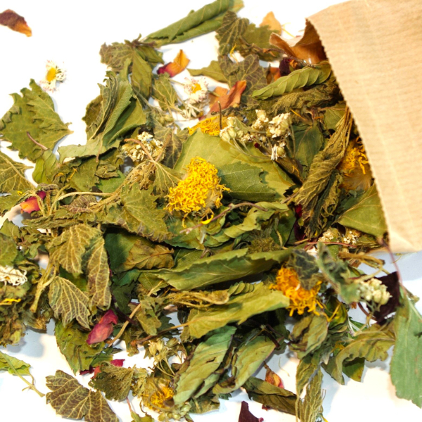 Zutaten: Brennnessel, Orangenminze (mentholarm, erinnert an Bergamotte-Orange), Löwenzahnblüten, Schafgarbe, Rose, Gänseblümchen, Birkenblätter