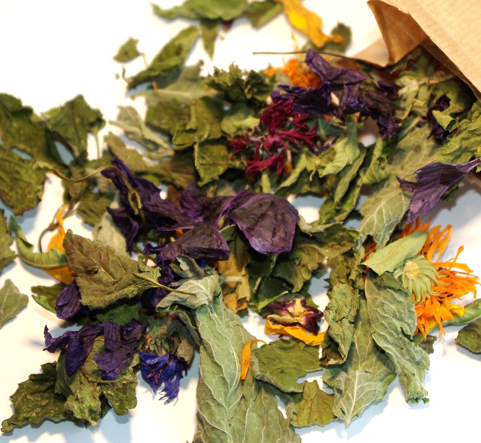 Zutaten: Zitronenmelisse, Zitronenverbene, Apfelminze, Ringelblumenblüten, Ysop, Sonnenblumenblüten, Malvenblüten, Rosenblüten, Kornblumenblüten