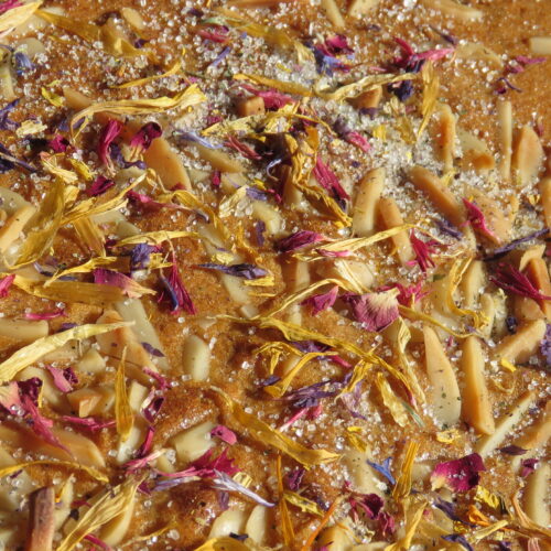 Nach dem Backen mit getrockneten Blüten und Blütenzucker bestreuen.